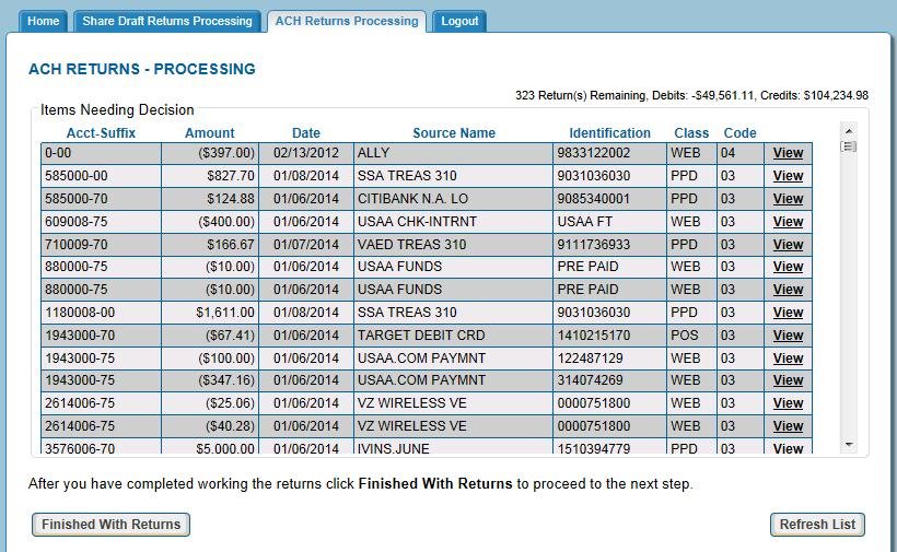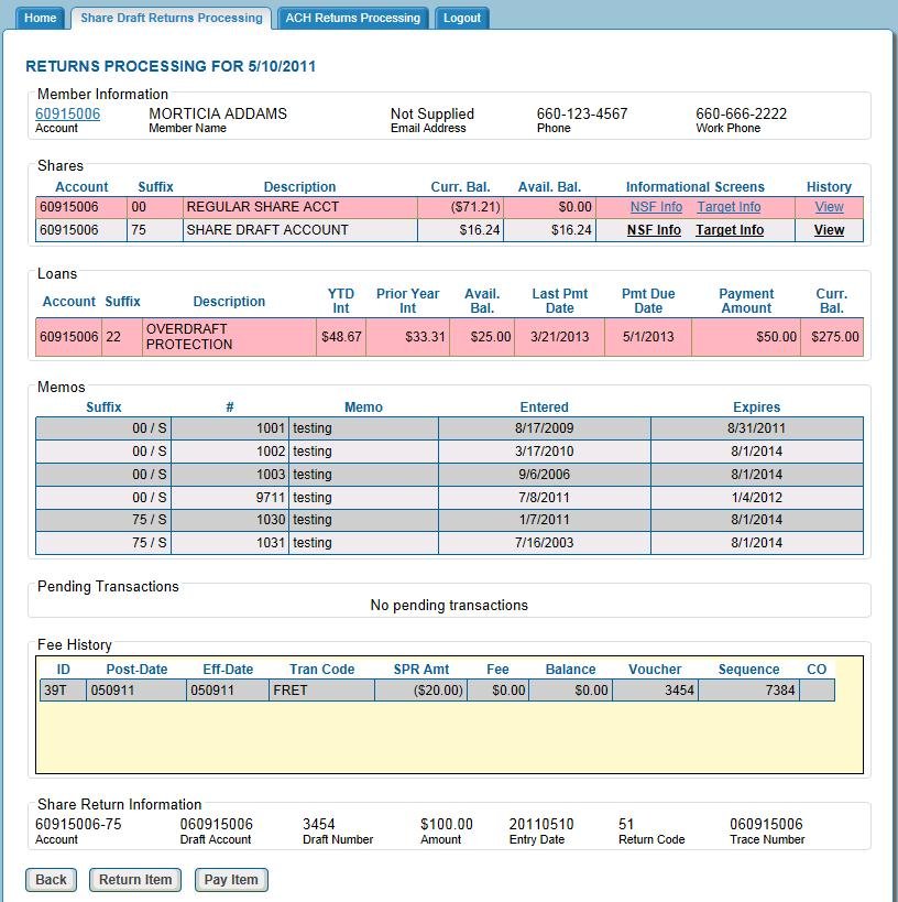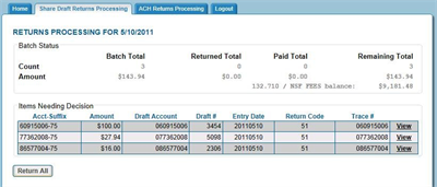 Used to automate the process of returns for both Share Draft and ACH returns.This product access the core data bases and streamlines the back office tasks with a point and click technology.